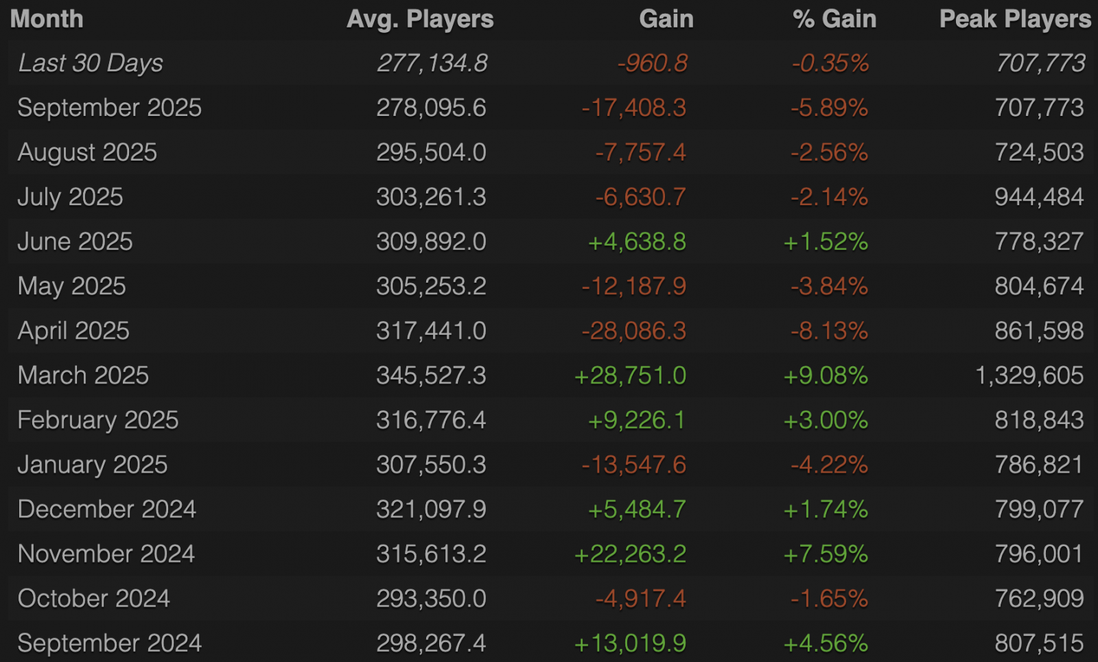 В сентябре средний онлайн PUBG: BATTLEGROUNDS снизился почти на шесть процентов по сравнению с августом 2025-го года – среднемесячная аудитория PUBG вновь опустилась ниже отметки в 280 тысяч человек.