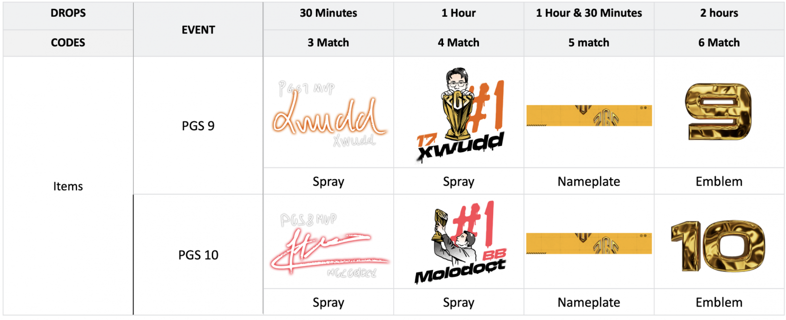 С 13 по 19 октября (PGS 9) и с 27 октября по 2 ноября (PGS 10) зрители турнира смогут получить граффити, эмблемы и именную табличку. Twitch Drops будут доступны на официальных трансляциях чемпионата, а также на стримах партнеров PUBG: BATTLEGROUNDS
